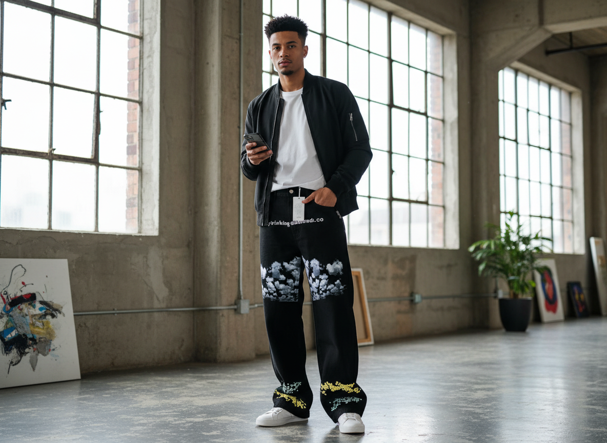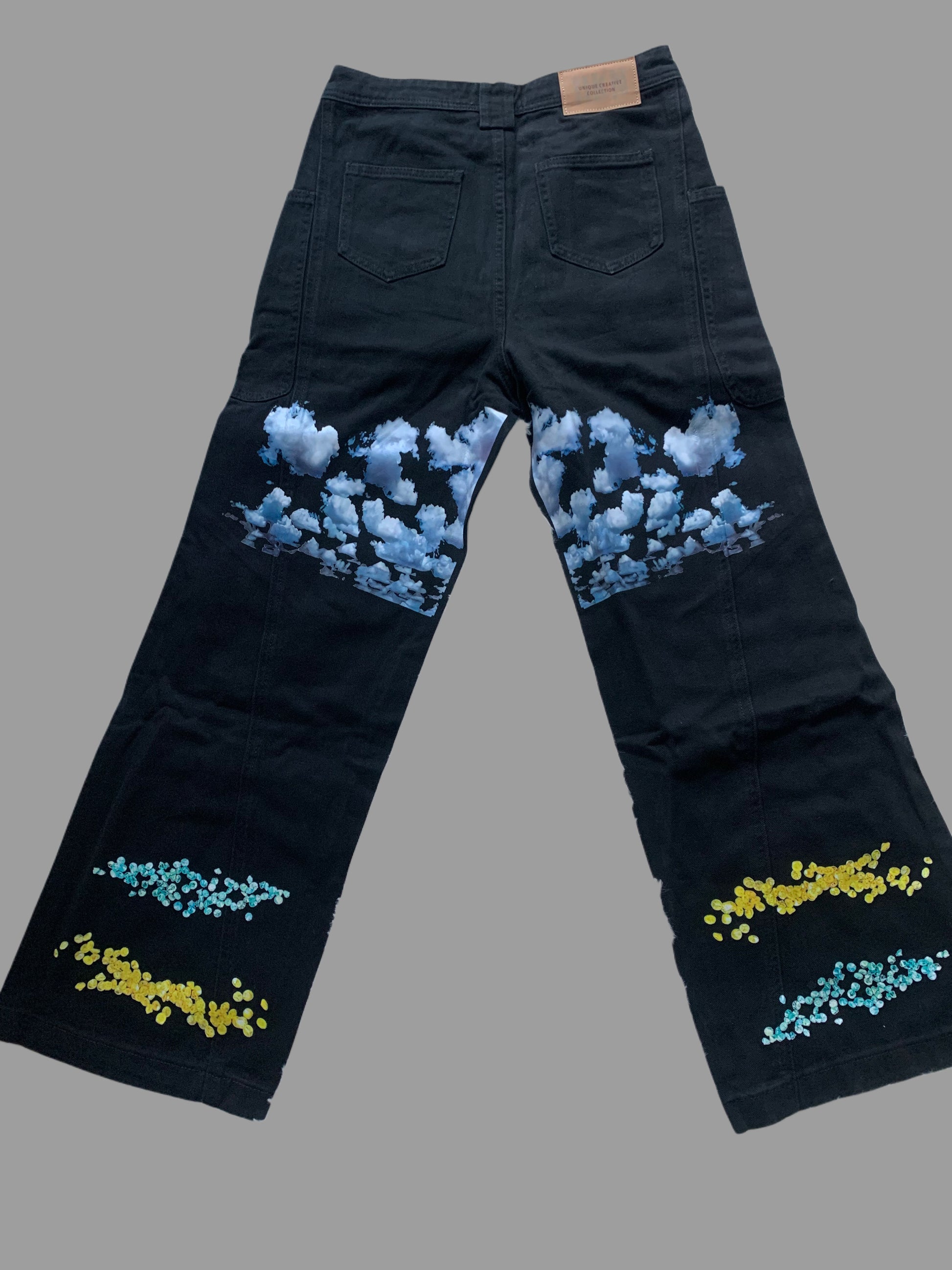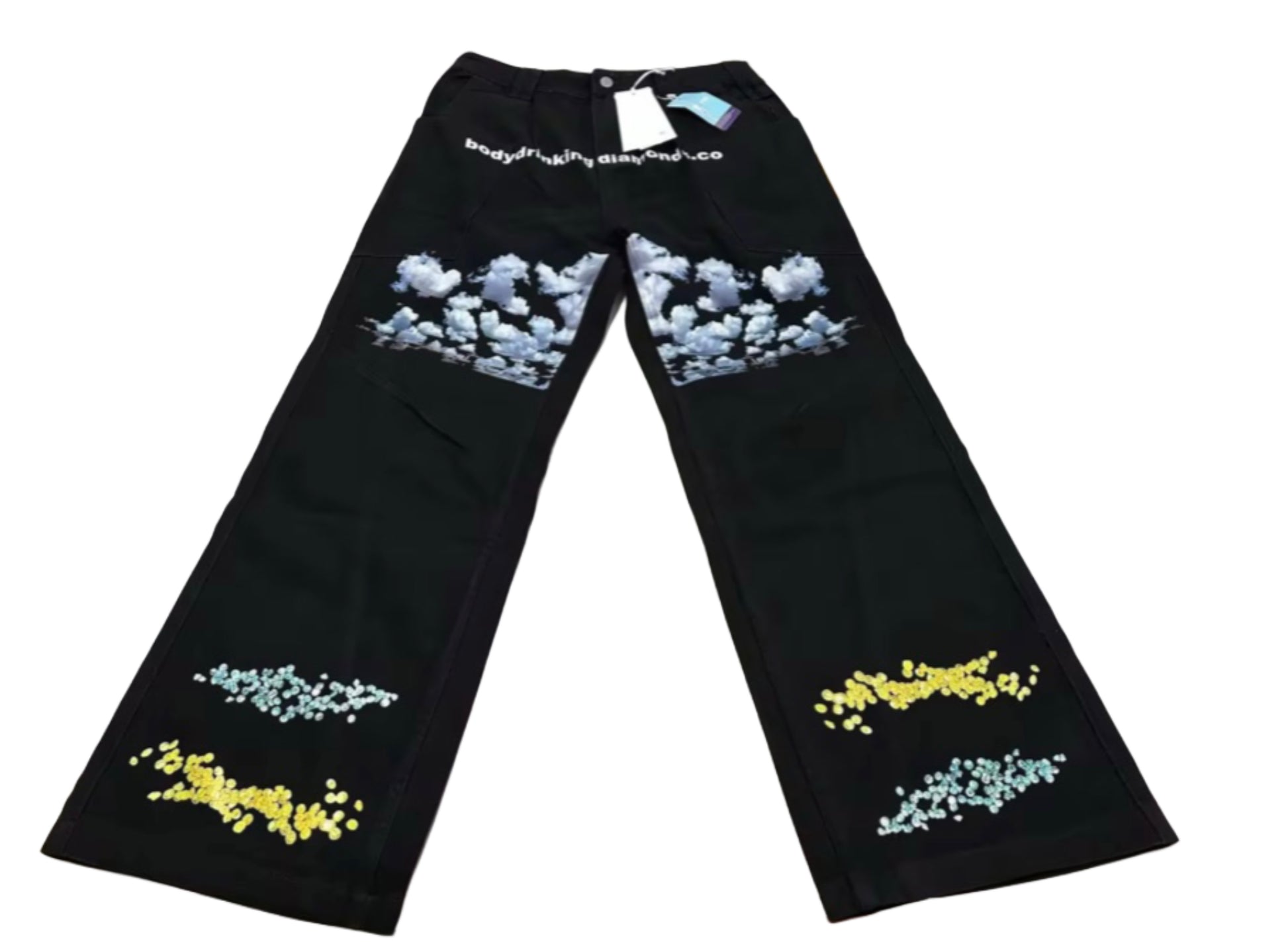 the cloudy diamond jeans offer a bold twist on classic denim with a soft, dreamy edge. Featuring a unique blend misty, cloud-like patterns with abstract diamond shapes, these jeans bring together attitude and artistic flair. Crafted from high-quality denims